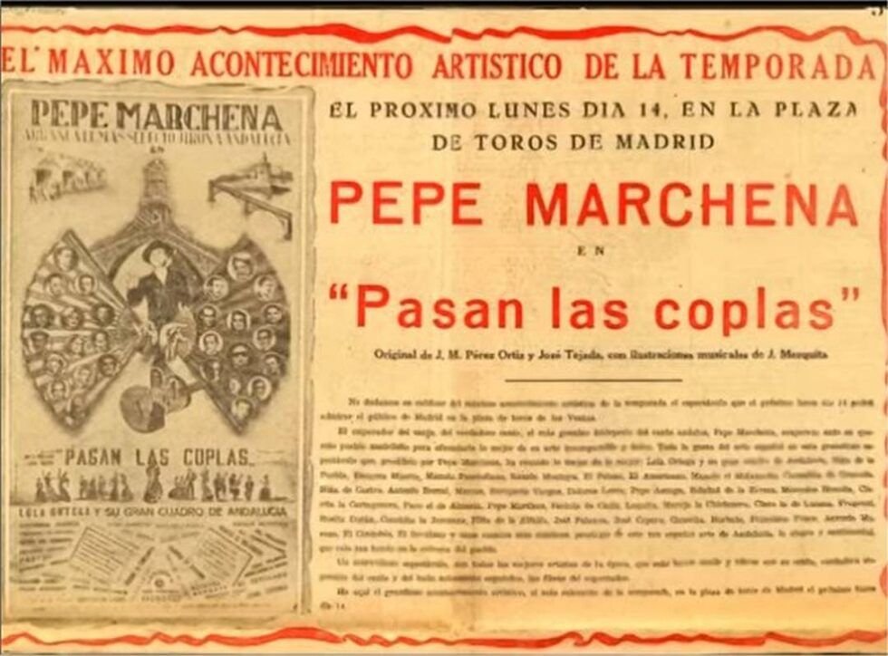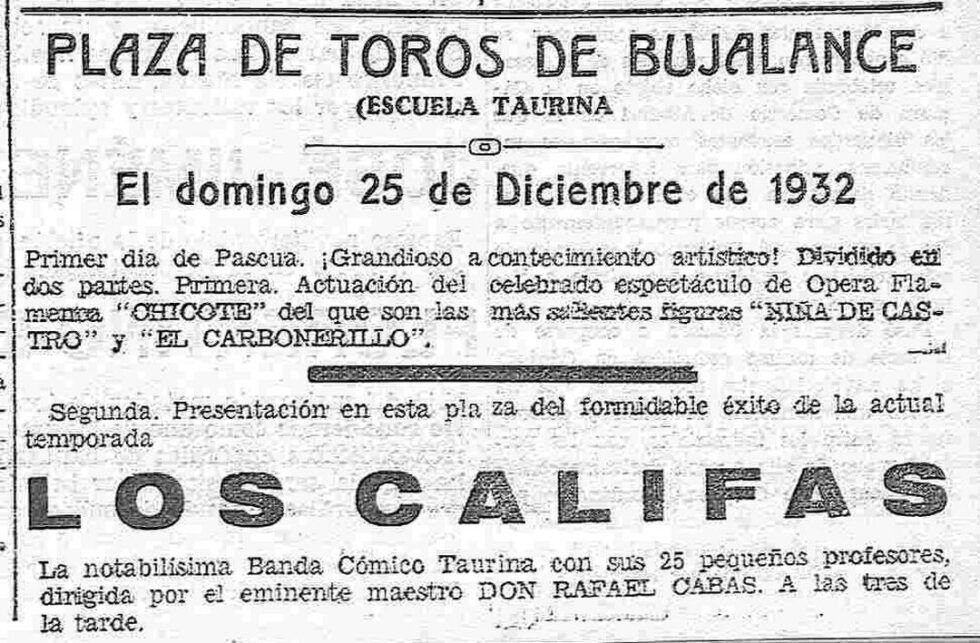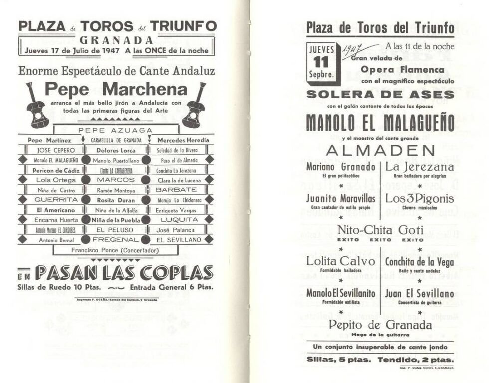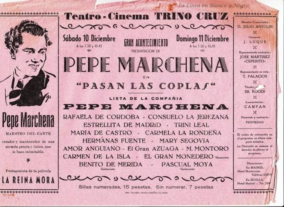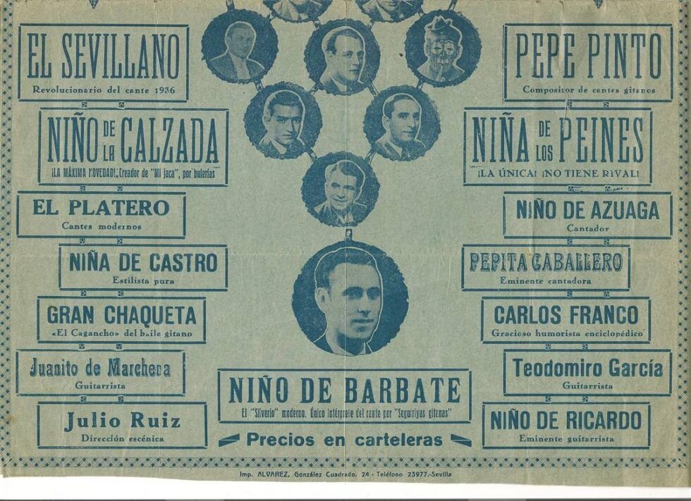 FRONTON CINEMA de Sevilla curioso espectáculo celebrado el lunes 6 de julio de 1936, 12 días antes del golpe de estado llamado Alarde Espectacular, en cabezado por la Niña de los Peines, en el que aparecen un elenco de artista como (Niño de la Calzada) (El Platero) (Niño de Azuaga) (Niño de Bárbate) y la (Niña de Castro) entre otros