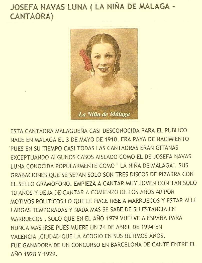 Josefa Navas Luna, conocida popularmente como “la Niña de Málaga”, nace en Málaga el tres de mayo de 1910. Cantaora castellana pese a la proliferación de las artistas gitanas de la época, sus grabaciones se concentran en cuatro discos de pizarra para Gramófono.