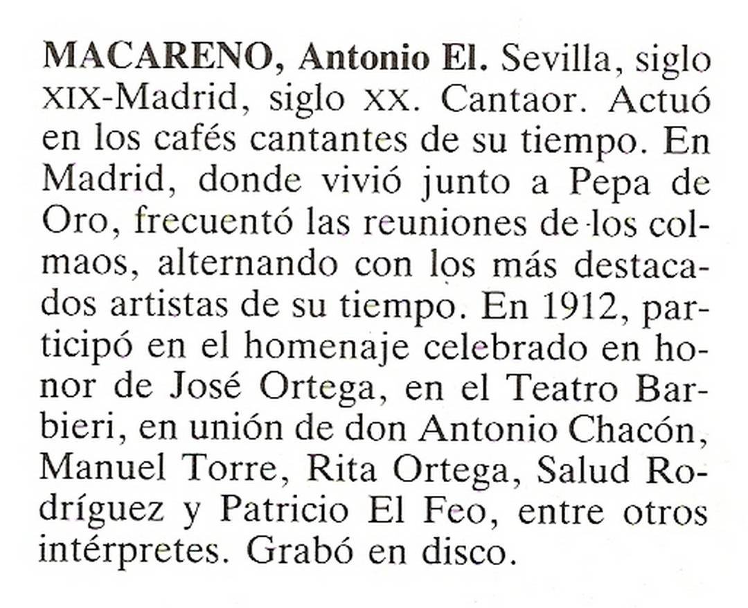 El Macareno fue un cantaor de categoría al ser contratado para cantar en los cafés de Madrid junto a las figuras de la época. Grabó pocos discos de pizarra, suficientes para hacernos ver que se trataba de un genial cantaor, poseedor de una voz clara, limpia, brillante y un estilo inigualable.
