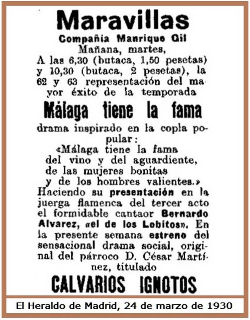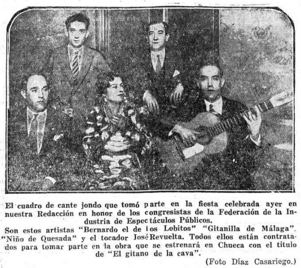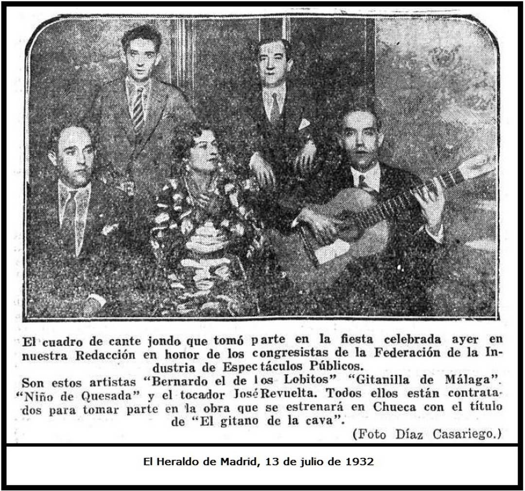 Dos son los títulos que interpretó y grabó en discos de pizarra Bernardo el de los Lobitos: “La gente”, y “Ni a puñalaítas ni a tiros” malagueñas de El Canario. Por último “Del convento las campanas” cuyo autor es Don Antonio Chacón.