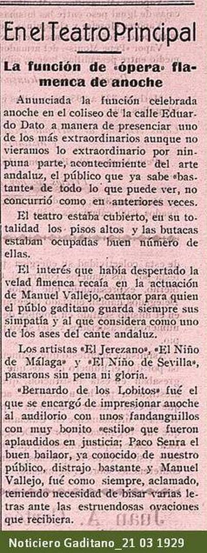 Esta bulería sigue la línea melódica de El Niño de Gloria o de su hermana Luisa La Pompi y sus remates finales nos evocan a los aires grabados por Manuel Vallejo.