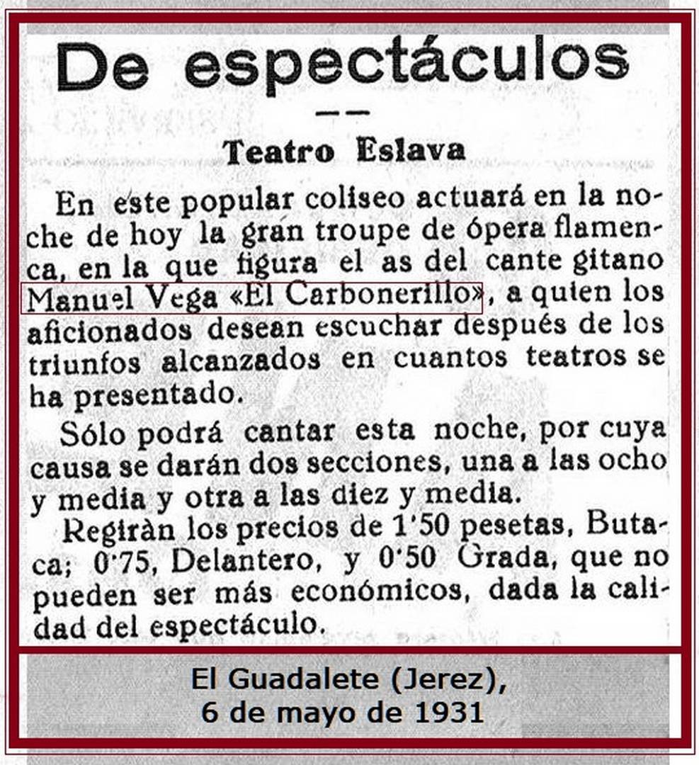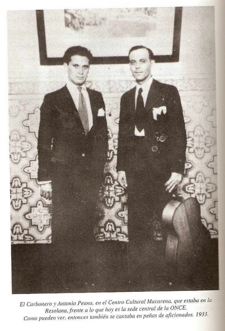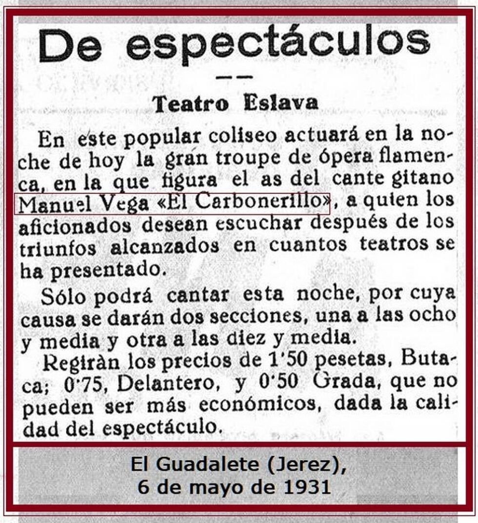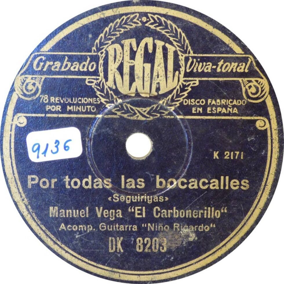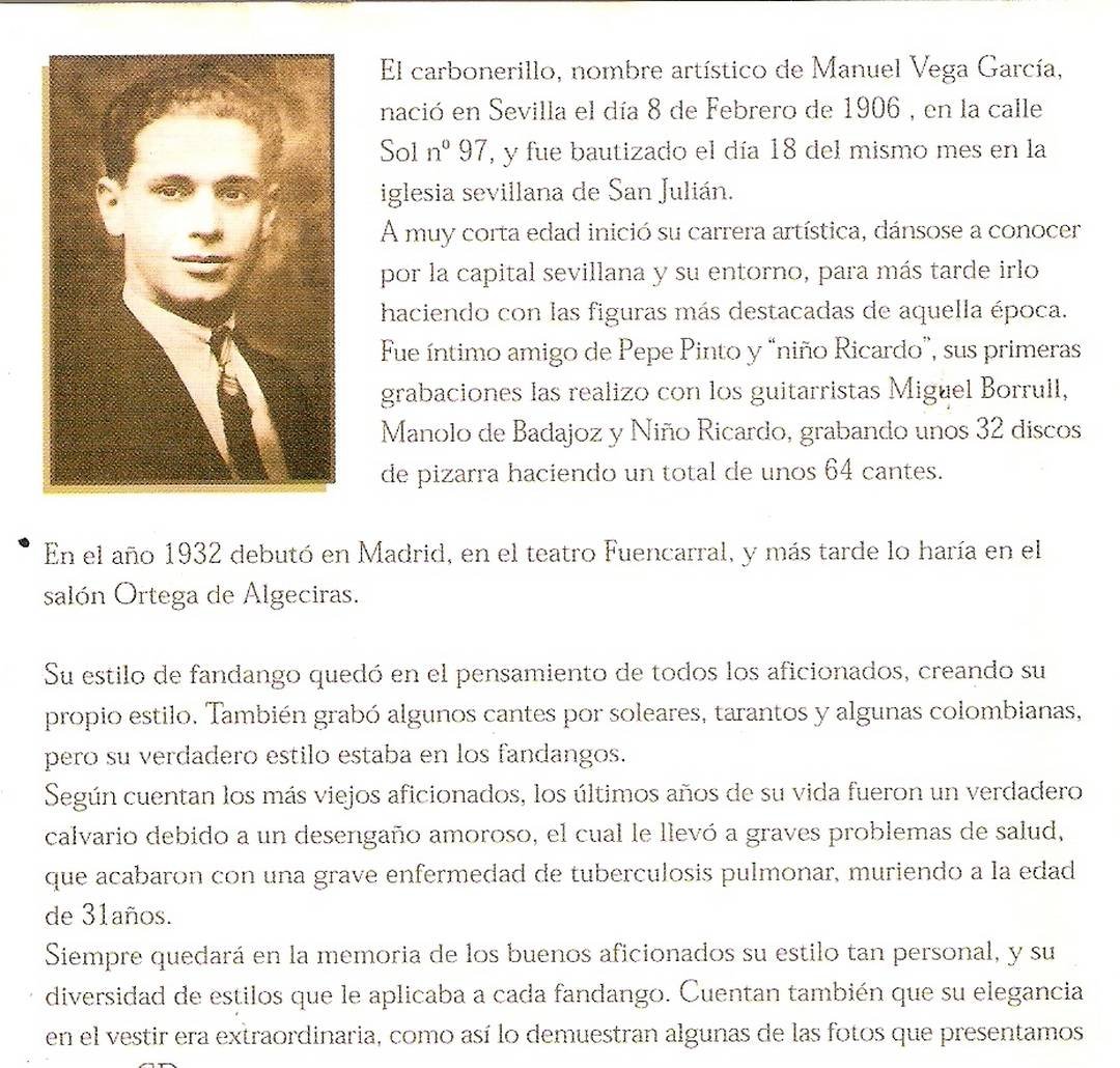 Manuel Vega García, conocido como El Carbonerillo, nació el 8 de febrero de 1906 en la sevillana calle Sol, en pleno barrio de la Macarena, y murió el 6 de abril de 1937 en la calle Don Fadrique de la misma ciudad, a causa de tuberculosis. Su padre, carbonero de oficio y cantaor aficionado, le transmitió desde la infancia el amor por el cante. Criado en un entorno humilde, con siete hermanos, su madre Rocío García Cuesta se ocupaba íntegramente del hogar. Desde pequeño mostró talento para el flamenco: con solo seis años ya cantaba fandanguillos en la fábrica donde trabajaban sus hermanas, y a los doce debutó en el Café Concierto Novedades. Junto a amigos como Pepe Pinto y el Niño de Marchena, formó parte de un trío infantil que asombró a Sevilla. Durante su adolescencia recorrió ventas y tabernas, y fue desarrollando un estilo propio, melancólico y apasionado, con letras que hablaban de pobreza, amor, desengaño y el dolor profundo del alma.