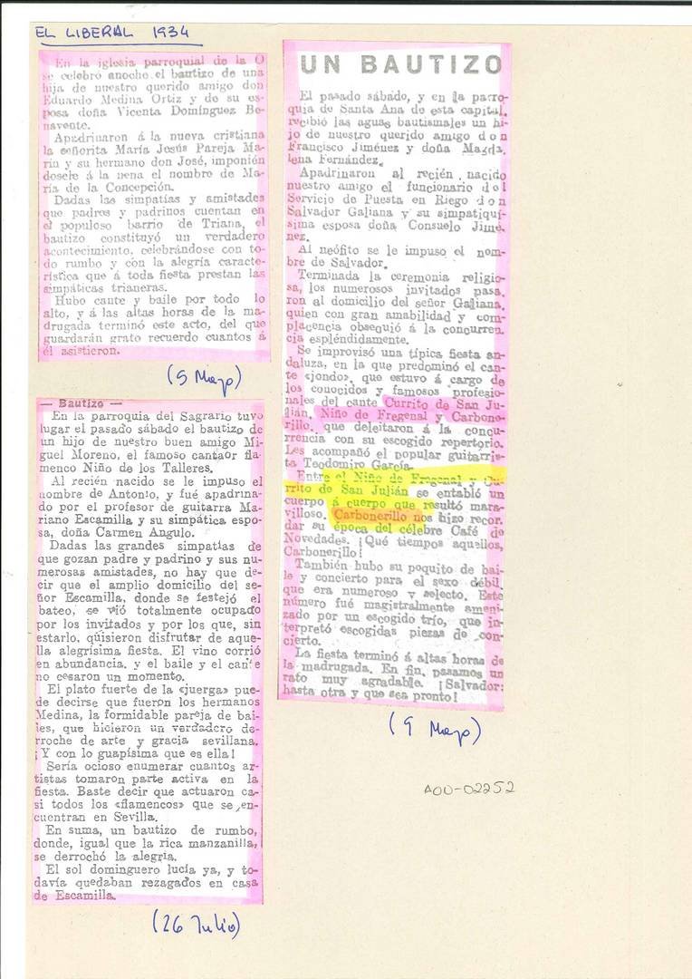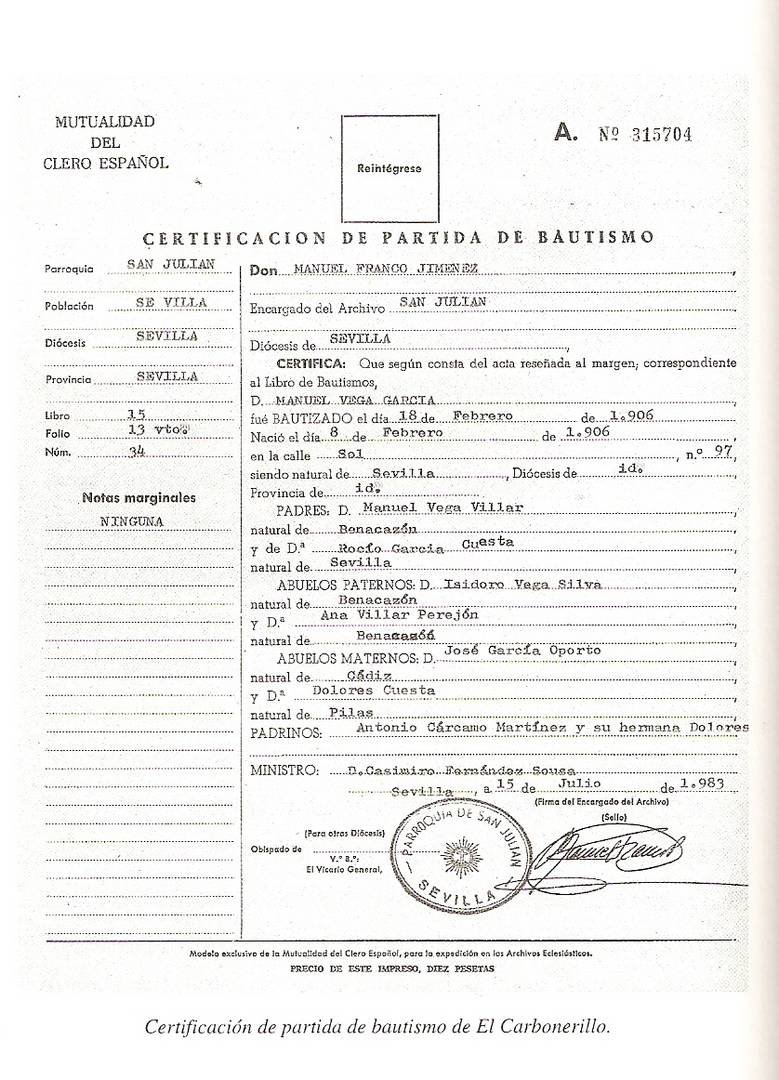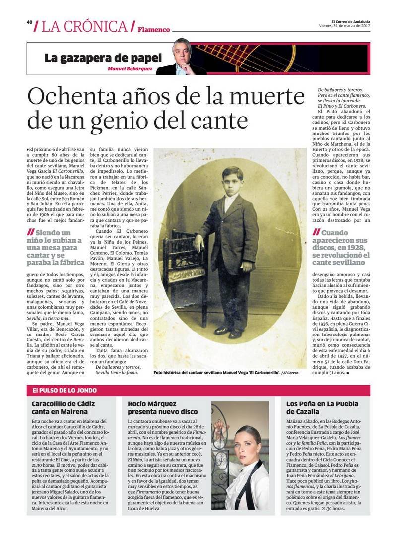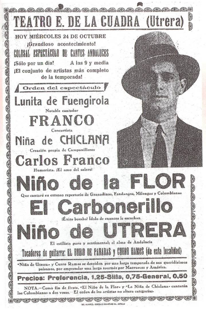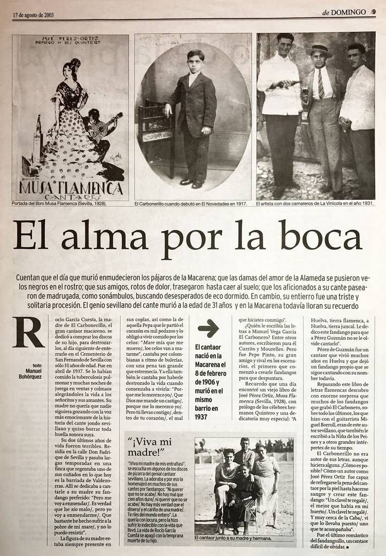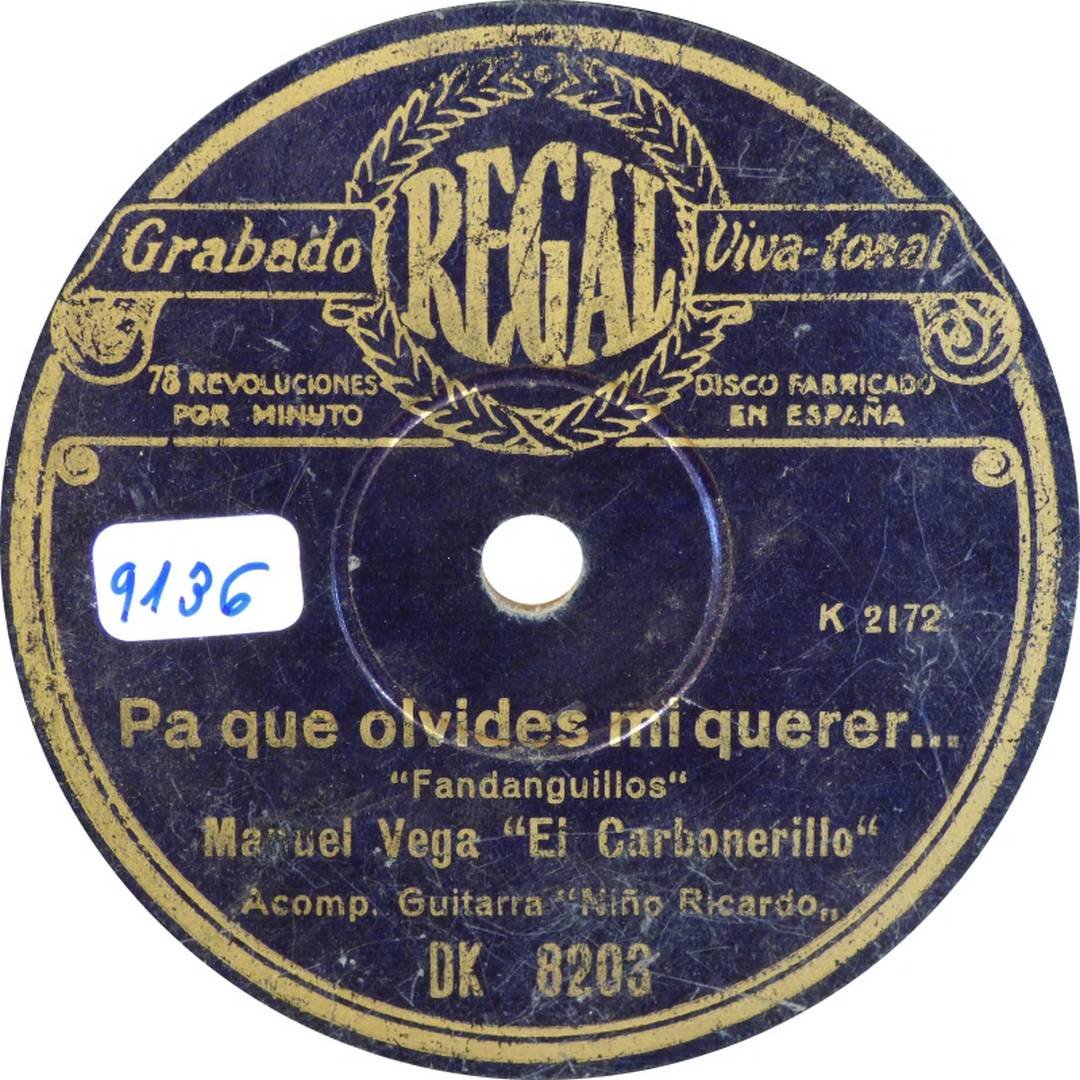 Manuel Vega García, conocido como El Carbonerillo, nació el 8 de febrero de 1906 en la sevillana calle Sol, en pleno barrio de la Macarena, y murió el 6 de abril de 1937 en la calle Don Fadrique de la misma ciudad, a causa de tuberculosis. Su padre, carbonero de oficio y cantaor aficionado, le transmitió desde la infancia el amor por el cante. Criado en un entorno humilde, con siete hermanos, su madre Rocío García Cuesta se ocupaba íntegramente del hogar. Desde pequeño mostró talento para el flamenco: con solo seis años ya cantaba fandanguillos en la fábrica donde trabajaban sus hermanas, y a los doce debutó en el Café Concierto Novedades. Junto a amigos como Pepe Pinto y el Niño de Marchena, formó parte de un trío infantil que asombró a Sevilla. Durante su adolescencia recorrió ventas y tabernas, y fue desarrollando un estilo propio, melancólico y apasionado, con letras que hablaban de pobreza, amor, desengaño y el dolor profundo del alma.