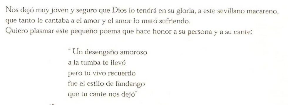 “Con mi bolsico en la mano” es una hermosa taranta con aires de El Niño de Marchena. Es una taranta corta, no exenta de dificultad, vibrante, directa y dulce como el almíbar como todo lo que manifestaba nuestro homenajeado cuando daba muestra de su arte.