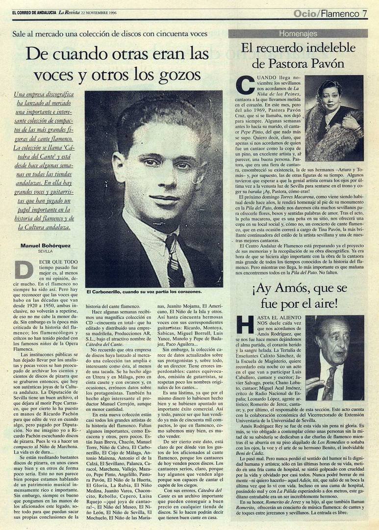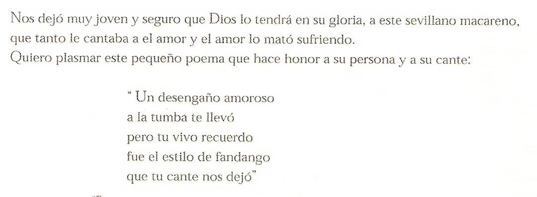 Su voz dulce, su quejío contenido y su capacidad de emocionar lo convirtieron en una leyenda precoz. Las letras que cantaba, muchas de su propia autoría, reflejaban con hondura sus vivencias y conflictos. Se le llegó a conocer como “El Rey del Fandanguillo”. Sus últimos años fueron trágicos: enfermo, sin recursos, viviendo en condiciones duras. La leyenda dice que el día de su muerte enmudecieron los gorriones de la Macarena, y que su madre, rota por el dolor, intentó destruir todas sus grabaciones. Fue homenajeado en 2006 en la Bienal de Flamenco de Sevilla. Hoy sigue vivo en la memoria de los aficionados y en la voz rota de sus fandangos, que siguen emocionando a quien los escucha. Su mejor biógrafo, Manuel Bohórquez, ha dedicado años a reconstruir su figura, su legado y su profunda huella en la historia del flamenco.