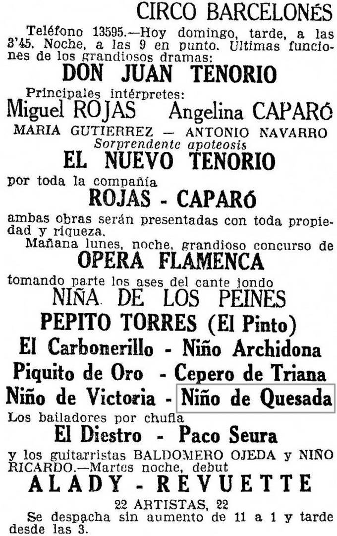 Su vida personal estuvo marcada por la bohemia y la bebida. Su familia intentó alejarlo del cante para que trabajara en una fábrica textil, pero pronto volvió a los escenarios. Se integró en compañías como las de Torres-Palacios y Vedrines, actuando junto a los más grandes de la época. Fue figura destacada de la Ópera Flamenca, grabando unas sesenta piezas, grabadas todas en tan solo tres años (1929 y 1932), sobre todo fandangos y otros cantes con guitarristas como Niño Ricardo, Sabicas, Miguel Borrull y Manolo de Badajoz. En discos de pizarra dejó registradas joyas del cante que han sobrevivido gracias a coleccionistas y reediciones parciales. Su discografía casi completa viene recogida en un triple CD acompañado de un libreto, escrito por el afamado crítico Manuel Bohorquez.