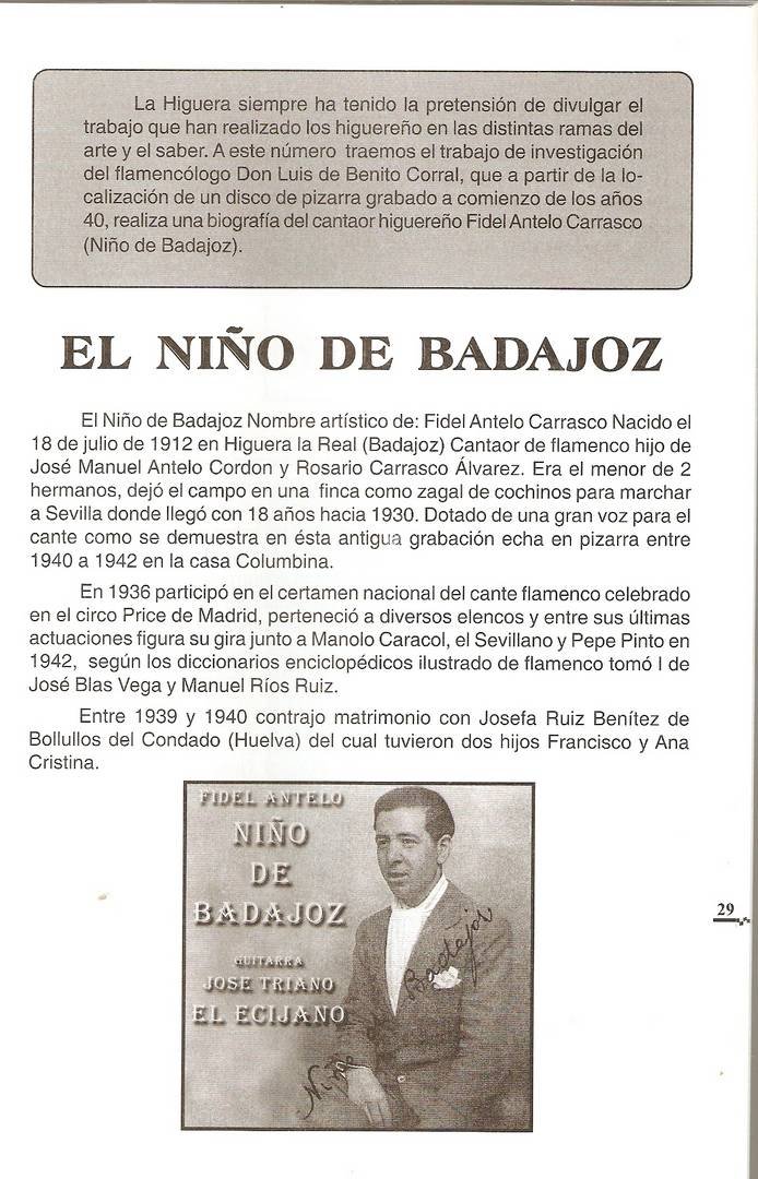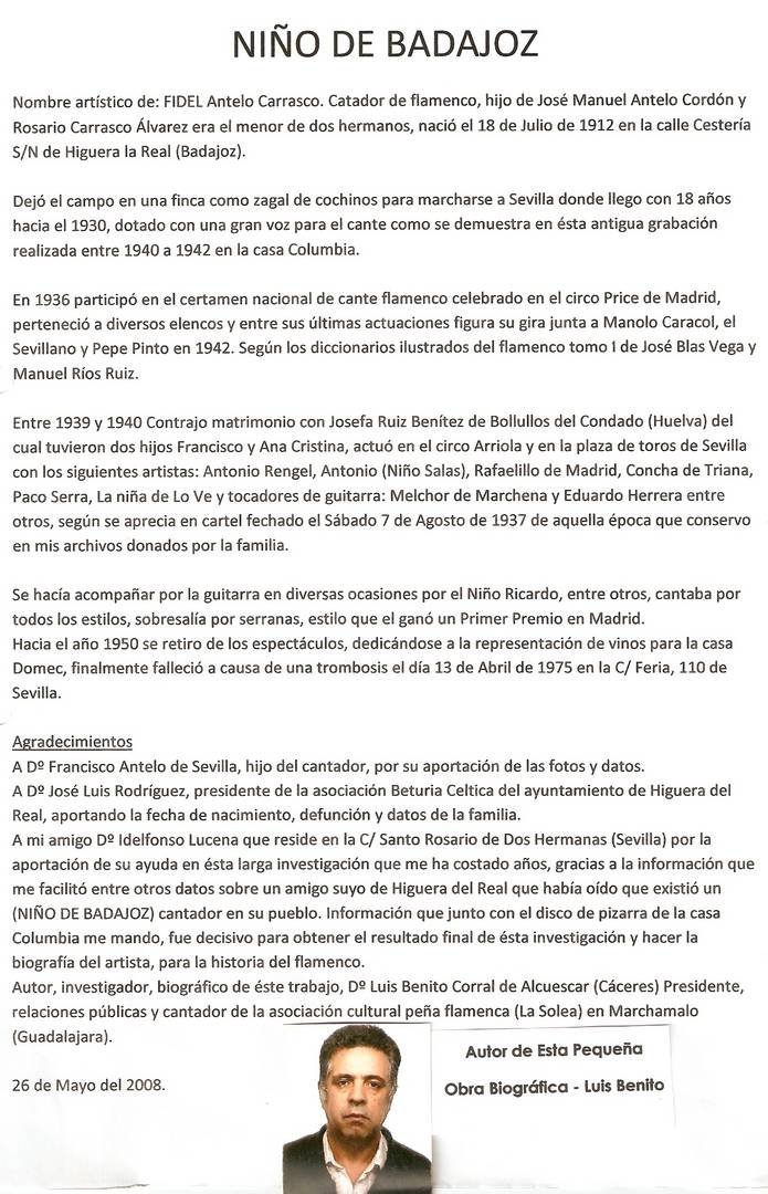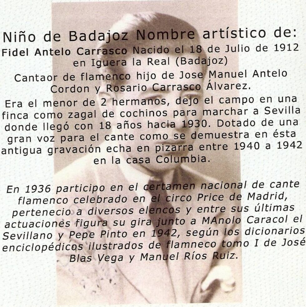 Fidel Antelo Carrasco, cantaor mas conocido para el flamenco como Niño de Badajoz, nace en 1912