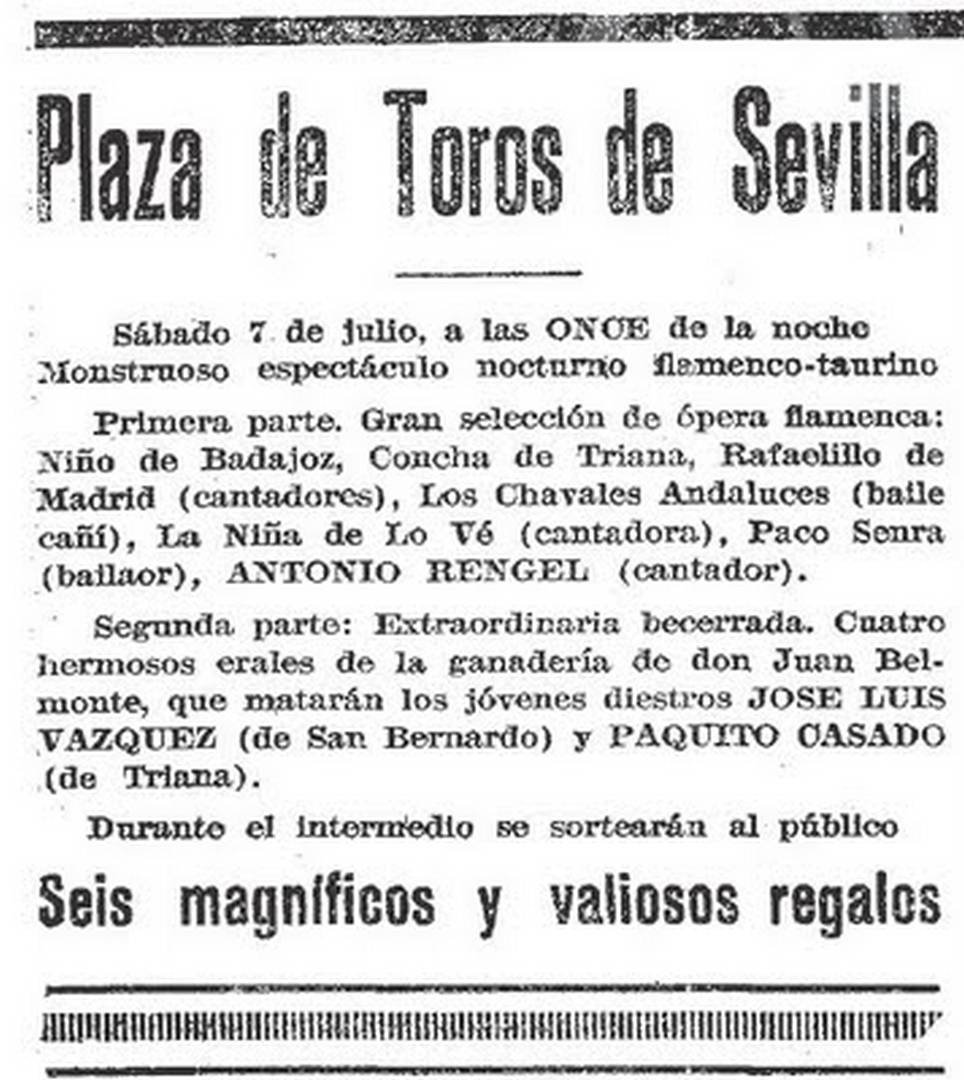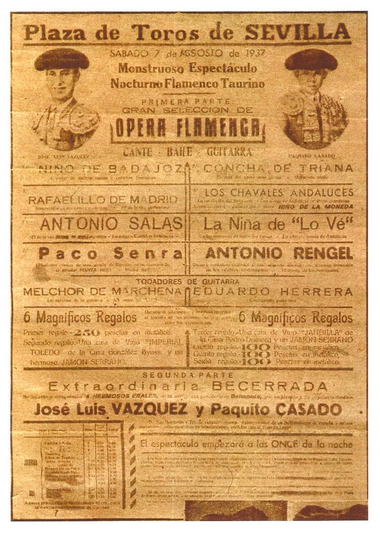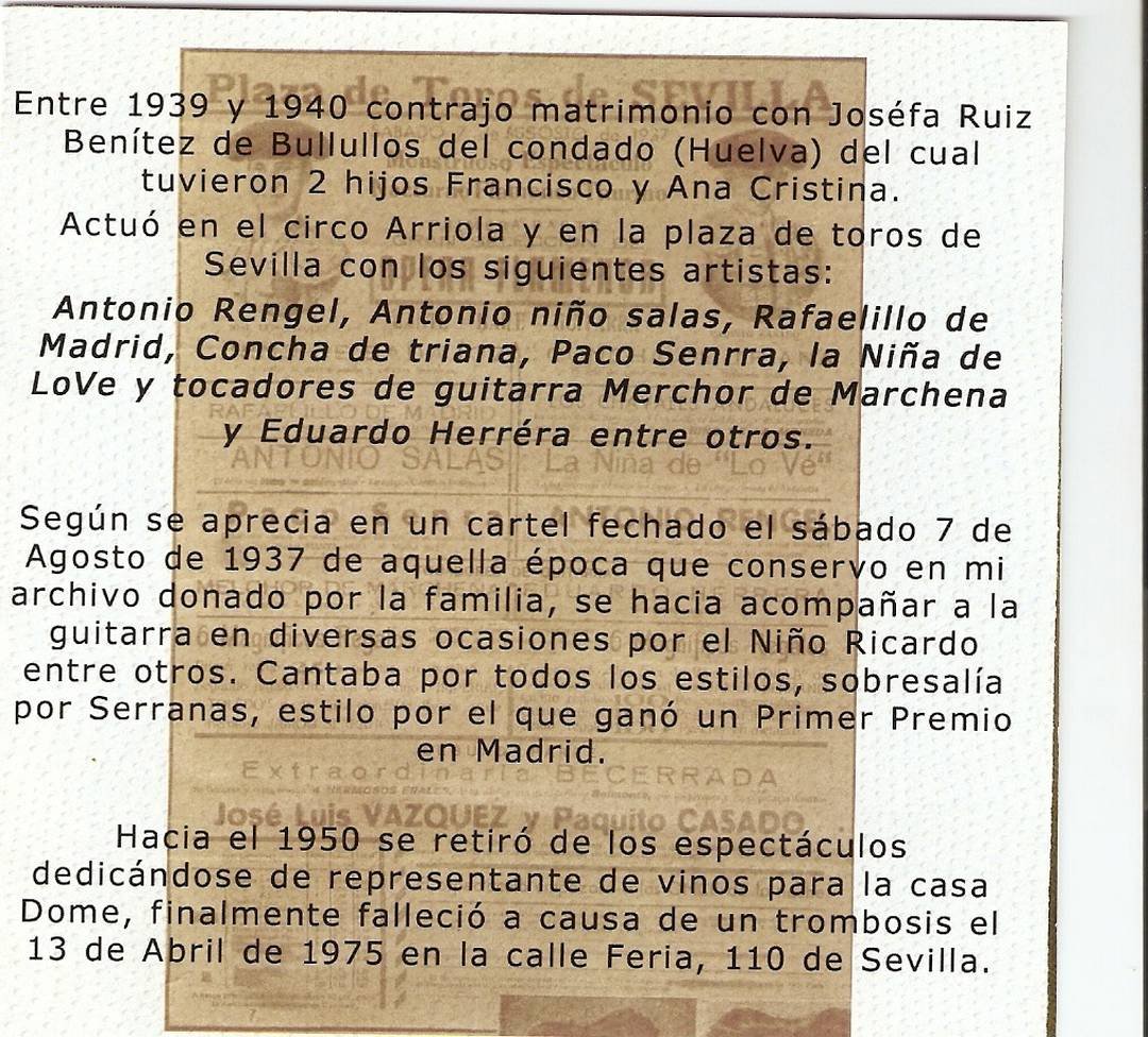 En 1936 participa en el Certamen nacional de Arte Flamenco celebrado en el Circo Price de Madrid y en 1937 tenemos constacia de sus actuaciones realizadas en la plaza de toros de Sevilla.