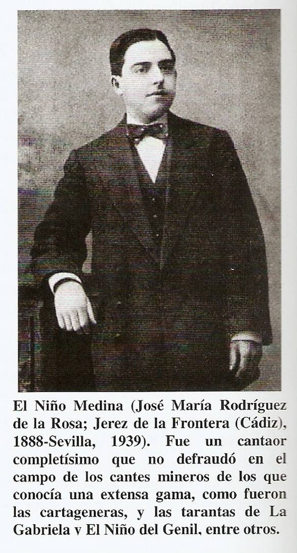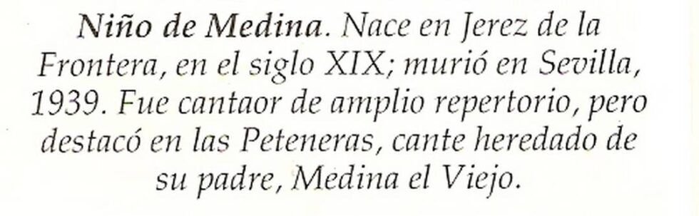 “Yo no creo ni en mi mare” y “Al pie de tu sepultura” son las dos letras que grabó El Niño de Medina. Hay quien dice que El Niño de Medina no tiene ningún tipo de vinculación con Medina El Viejo; otros, en cambio, apuntan que se trataba de su hijo. Nos quedaremos con esta última teoría, por lo que El Niño de Medina trajo al disco de pizarra los sones de su padre. Posteriormente fue engrandecido por La Niña de los Peines y por otros muchos más cantaores que grabaron con éxito este estilo.