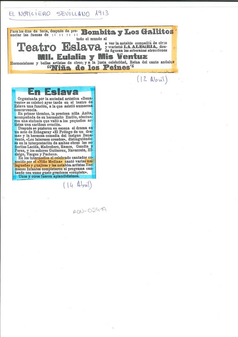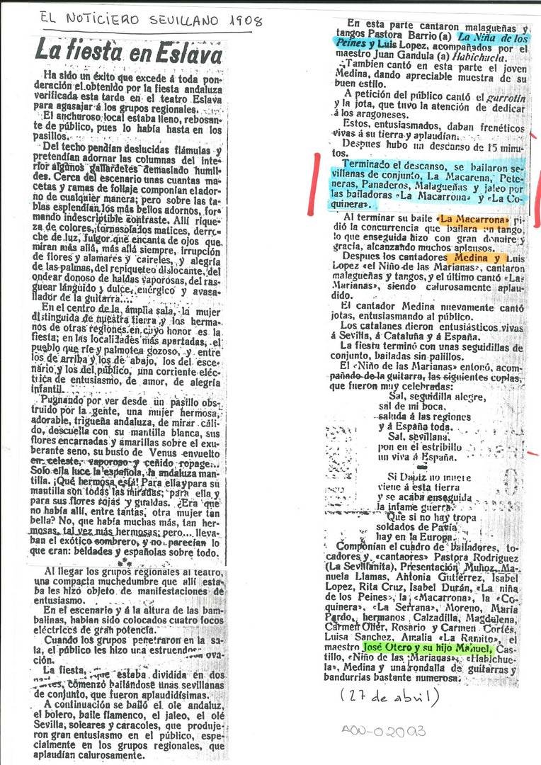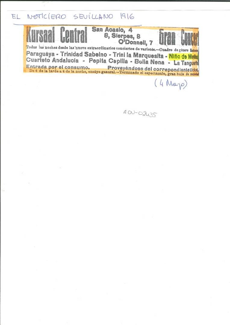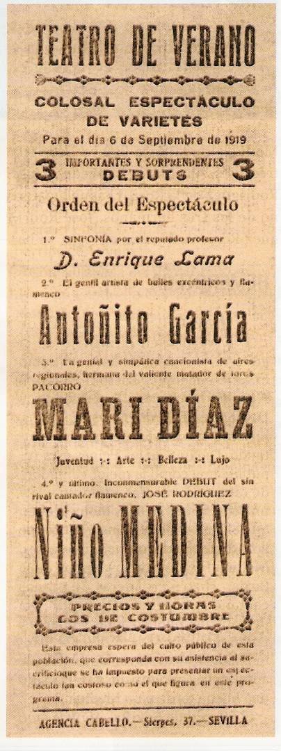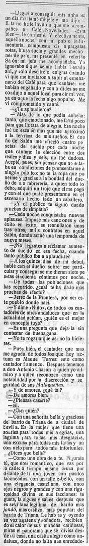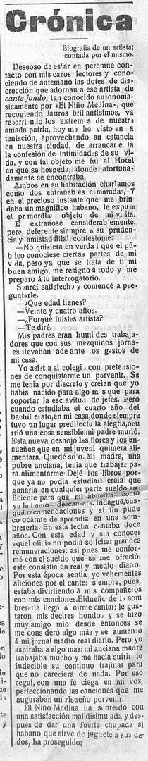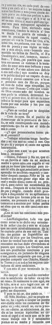 “Yo nací en Argel” y “Cuando tienen un vestío” son las dos letras iniciales que interpreta El Niño de Medina con aires de Jerez. Nos recuerda en gran medida a Pastora Pavón “La Niña de los Peines”, por lo que nos planteamos la eterna duda de quién copió a quién, jamás dilucidada.
