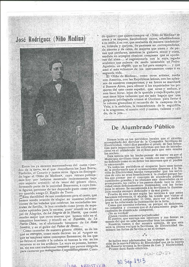 José Rodríguez de la Rosa, conocido como Niño de Medina, nació en 1888 en Jerez de la Frontera, en una familia procedente de Arcos de la Frontera. A pesar de su origen gaditano, su formación artística y su identidad profesional estuvieron estrechamente ligadas a la ciudad de Sevilla, donde vivió gran parte de su vida y donde se fraguó como cantaor.