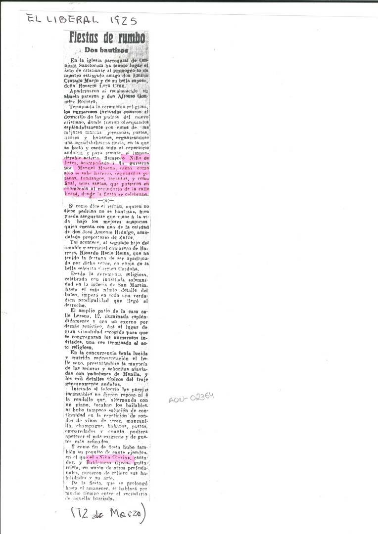 Bajo el título de “Fiesta jerezana” El Niño de Gloria ejecuta unas impresionantes bulerías con aires de Jerez. En ocasiones imita a su hermana Luisa La Pompi, cantaora que se puede disfrutar en el canal de Flamendro y en la web de la Sociedad de Pizarras: www.flamencopizarra.com