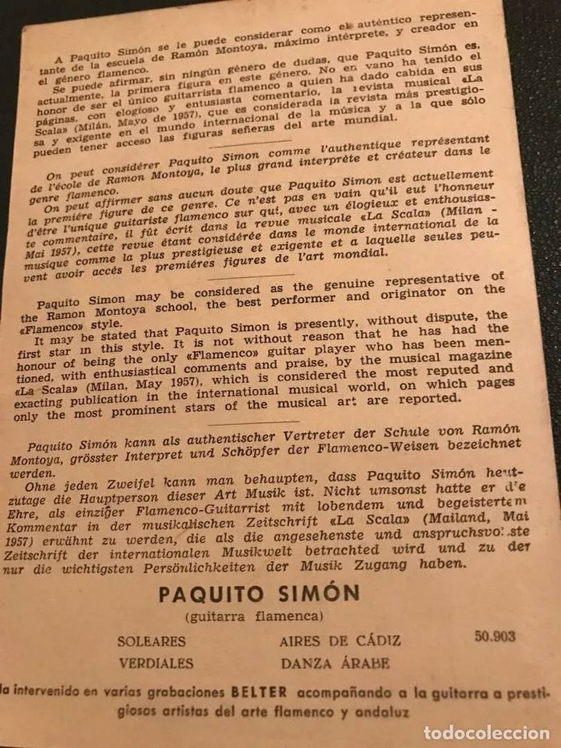 Por desgracia, poco podemos precisar nada acerca de la vida de este cantaor. Tan solo podemos decir que Paquito Simón nació en Barcelona, 1931 y falleció en el año 1970. Fue un destacado guitarrista de flamenco español, reconocido principalmente por su labor como acompañante de grandes figuras del cante.